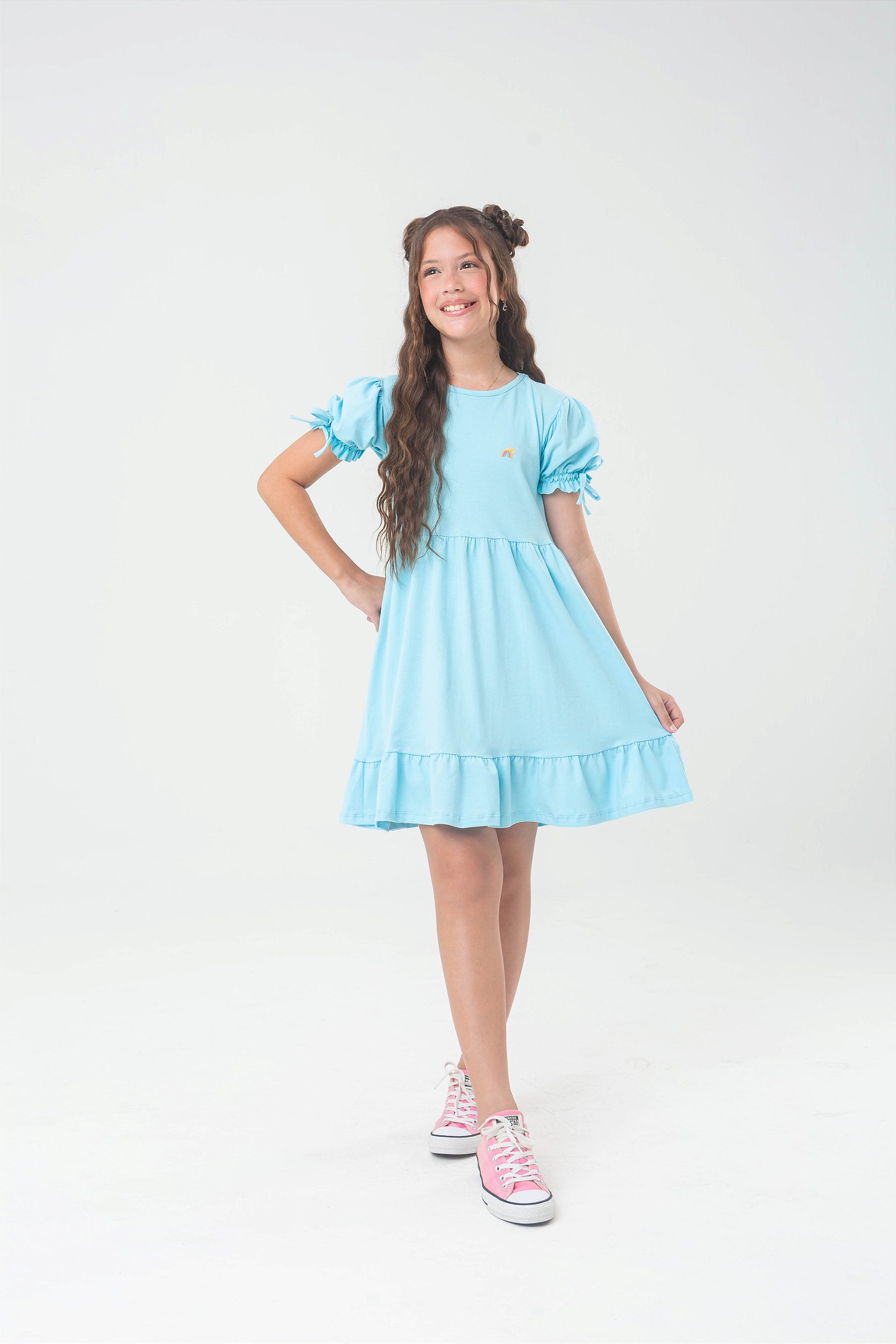 Detalhes: Vestido com elástico na manga com efeito bufante + laço de viés + Botton no busto
